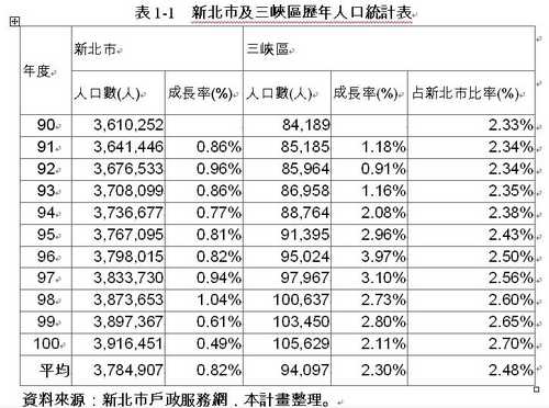 三峽區於民國100年底總人口為105,629人,90年至100年間人口平均成長率約2.3%,總成長率8.5%,其占新北市人口比例近十年人口平均為2.48%。