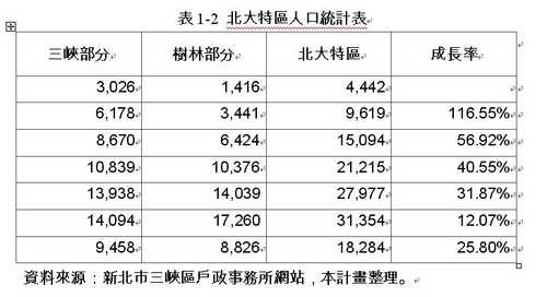 北大特區於民國100年底總人口(包含三峽區及樹林區)為31,354人,95年至100年間人口成長率約25.8%,約占新北市人口比例0.467%。