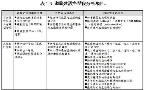 道路建設可應用生態工法,因應主客觀條件之不同,應落實個案基地生態環境調查,適地適用的提出處理對策,其各階段應分析項目整理如表1-3。