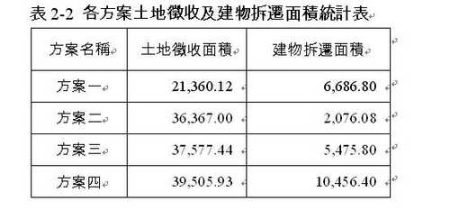 (二)各方案土地徵收面積及建物拆遷面積比較