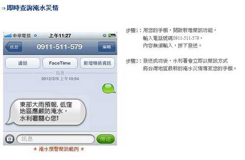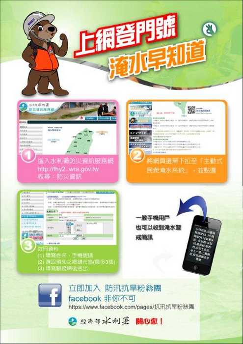 經濟部水利署提供「上網登錄手機門號,接收淹水警戒簡訊服務」,