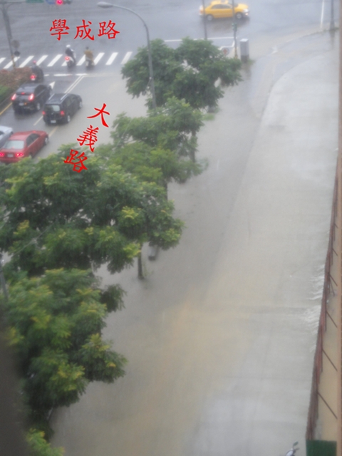 目前雨勢變小(毛毛雨), 大義路積水已全退了.