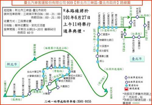 為提供三峽地區民眾往返台北市區的便捷交通,新北市府交通局新闢九三九「新北市三峽區─台北市政府」快速公車昨日中午十二時起上路營運,並至六月三十日提供民眾免費搭乘,且今天上午搭乘前三班次由三峽往台北的民眾,將可獲贈營養早餐一份。市府交通局表示,新闢之九三九線快速公車係由