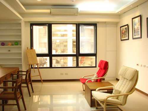 目前只擺放2張IKEA的扶手椅和工廠訂做的多功能原木茶几,預計再添購一套音響。