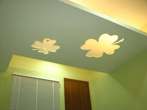 #14 天花板請兒子先在白報紙上畫上同比例的幸運草,再請木工依圖裁切。