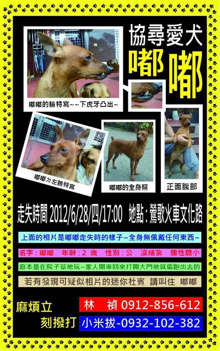 狗狗目前安置在我家,他因為體型,顏色各方面都太像我家走失ㄉ嘟嘟,從照片上看連飼主ㄉ我們都誤認ㄌ~~~