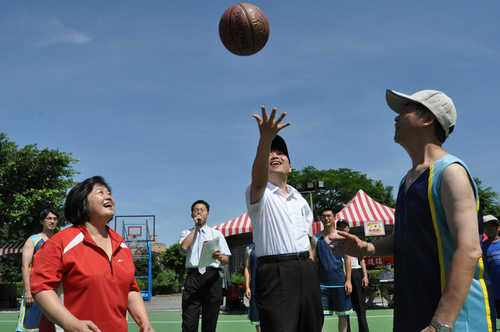 {記者黃秀麗新北市報導}新北新增籃球場,12日三峽防災公園的籃球場率先舉行啟用儀式。新北副市長侯友宜開球,民政局長陳嘉興、新北市議員王明麗跳球,為民政局、王明麗議員服務處和三峽區公所同仁組成的球隊進行友誼賽。