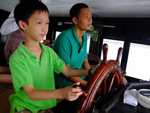 雨勢稍小, 到樓上的船長室, 船長很客氣的讓我們開船過過癮.