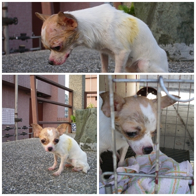 一位好心的高中女生撿到牠時的情況,破舊寵子裡的飼料盒爬滿螞蟻