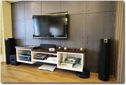 電視牆的材質是水泥板,雖然我原本想用水泥板原色來表現粗曠感,