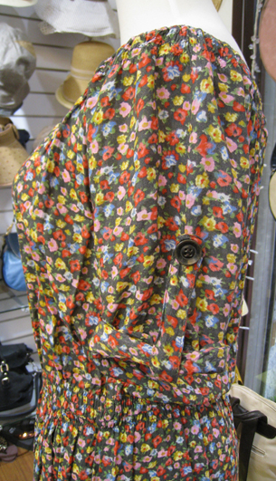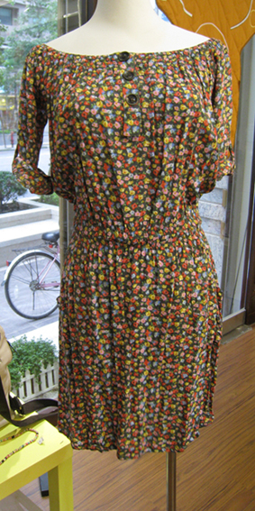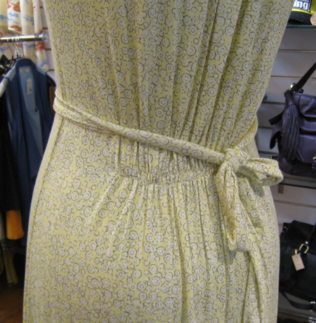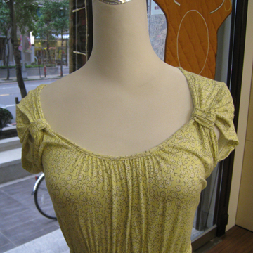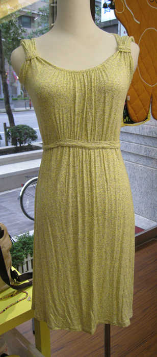 [backcolor=Yellow]2[/backcolor]. (鵝黃碎花) 肩部的小環為活動式, 可調整位置高低, 讓袖子可變包袖或細肩帶. 後面腰部有鬆緊帶, 可修飾腰臀. 此款彈性及垂墜感佳, 也相當適合當孕婦裝.