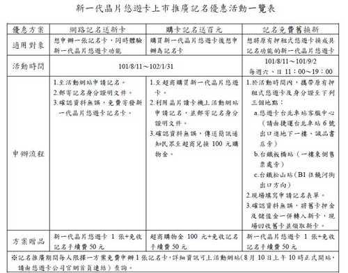 悠遊卡公司指出,本月十一日至一○二年一月卅一日推廣期間,只要從悠遊卡公司官網連結活動網址,申辦記名卡,即可免費獲一張價值一五○元的新一代晶片悠遊卡。若提前買卡了,只要申請記名確認資料無誤,也可獲超商一百元購物金並免收五○元手續費。
