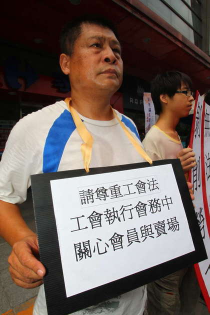 家樂福工會常務理事陳明德,掛著請尊重工會的抗議牌子,抗議家樂福對工會不夠尊重、要家樂福善待自家員工。曾伯愷攝