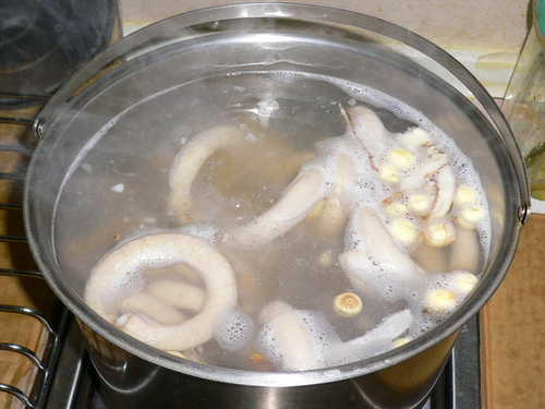 用熱水.先川燙一下(右邊正在燙.左邊已撈起)