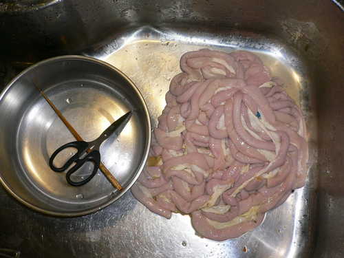 再來使用筷子.把腸子翻面.清洗腸壁面
