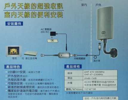 [*]獨家設計遠端供電功能 (附灌電器) ,當天線於戶外陽台或壁掛安裝時,可由室內作遠端供電,獲取最佳收訊效果,並可由數位電視接收機供電 。