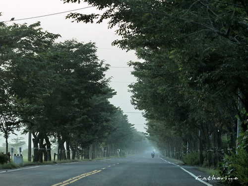 以印度紫檀為行道樹的172甲縣道筆直整齊,清晨六點的道路晨霧未退,東方初露曙光