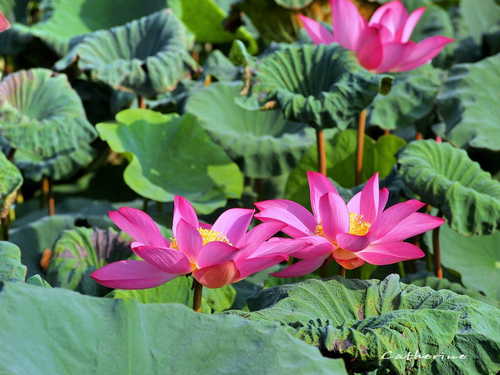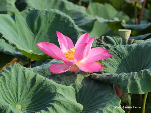 稻田中有幾處尚未乾涸的荷田,花兒在中秋之前做最後一次綻放