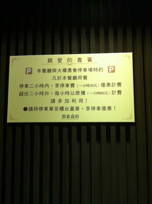 餐廳位置/營業時間/價位 (每星期一是環保日, 午晚餐有特價). 由北大特區可以搭乘 932 在府中站下車, 往捷運站一號出口方向走, 原素食府在右手邊, 它的招牌很大, 不會找不到.