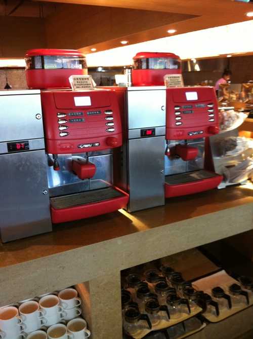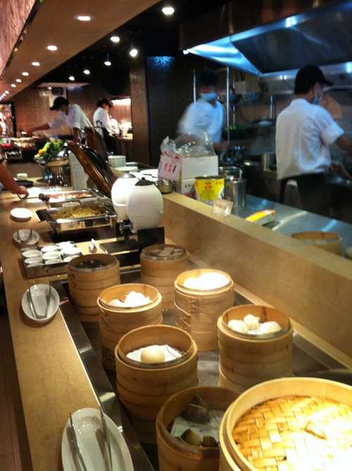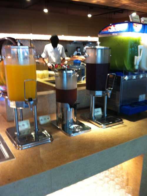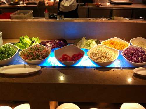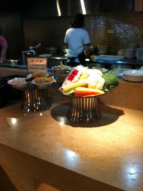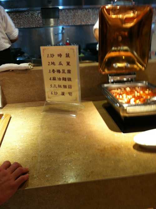 自助餐台的設計以一區一特色為主調, 有沙拉/小菜/熱炒/麵/麻辣燙/冰/甜點等, 素食的內涵豐富多變: