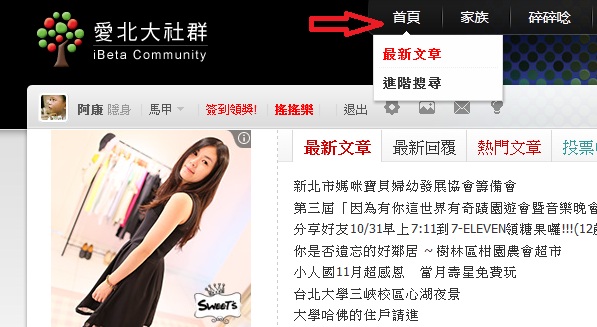 要查看更多的最新文章, 請參考下圖, 滑鼠游標停在紅色箭頭的首頁上即可出現 MENU