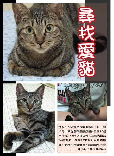 kwl 發表於 2010-10-13 13:37 繼2條狗之後 又有一隻貓走失了 希望你也能順利找回貓咪 走到北大的街上 我還沒看過貓呢 別成為北大特區第 ...