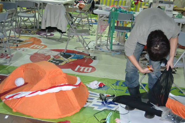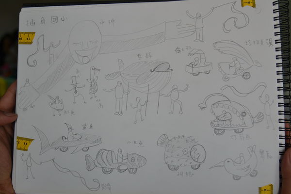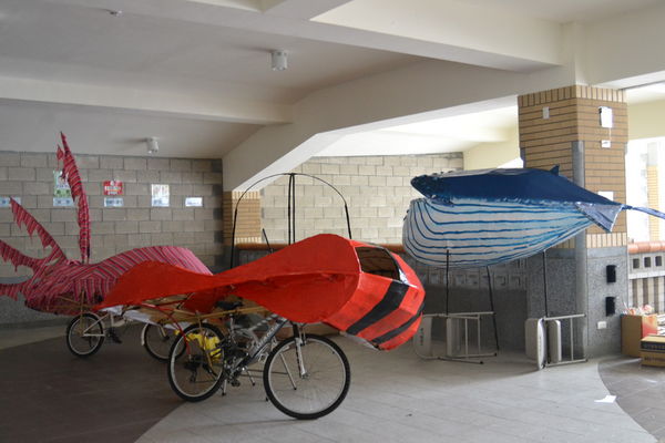 創意工作坊設在龍埔國小四樓,感謝林瑞昌校長在第一次聽我說要引進駐村藝術家舉辦嘉年華遊行時,就立刻答應把剛完工的大樓一個很大的展演空間借給我們使用。就像一個中央廚房,每天都有不同的食材被送進來,每天也有很多神奇的創作被完成。
