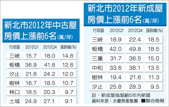 2012年即將結束,房仲業統計,這一年大台北房市雖有奢侈稅、實價登錄、豪宅限貸等多項利空,但各行政區房價仍都呈上漲,北市各區漲幅約3~16%,新北市則從4~18%。整體來說,新成屋較中古屋漲幅較大。
