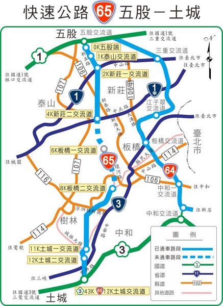 新北市交通局指出,台六十五線採分段通車,五股交流道到新莊中正路段,已在民國九十九年十二月開放通車;板橋縣民大道至土城交流道也在一○○年十月通車,目前僅剩新莊到板橋三點九公里路段尚未通車。