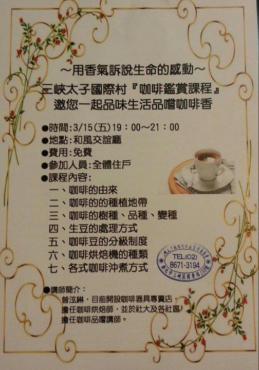 今天晚上七點,太子國際村社區將主辦一場免費的咖啡品嚐課程