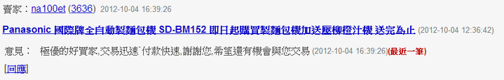 出售一台國際牌全自動製麵包機SD-BM152,去年10月4日在露天網拍以5,000元購入。