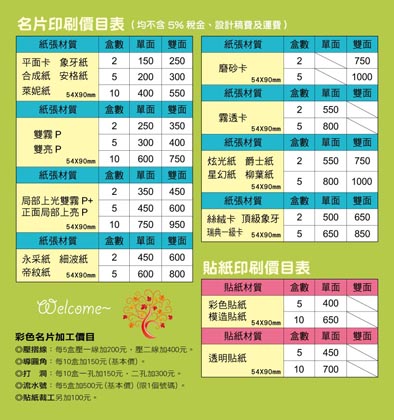 提供基本價目表給你參考(以下為單本價格,數量多可議價),歡迎到店參考樣品