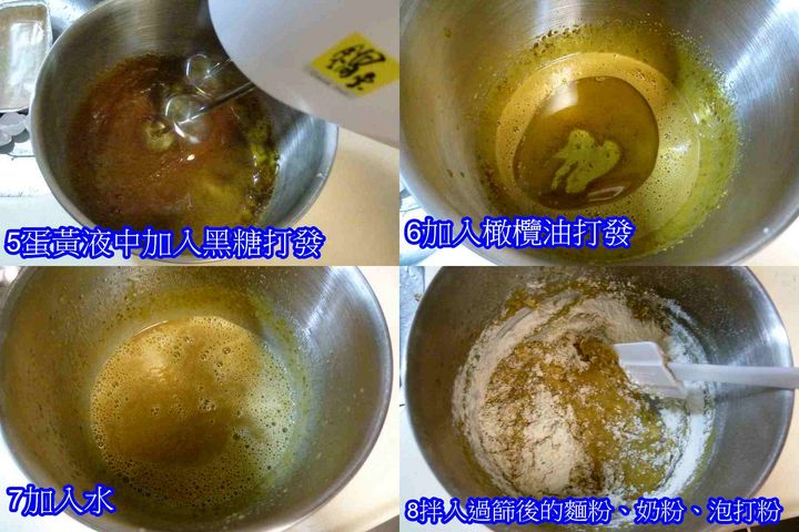 蛋黃糊: 四個,黑糖30克、橄欖油60克、水50克、奶粉兩大匙、低筋麵粉120克、無鋁泡打粉2/3小匙