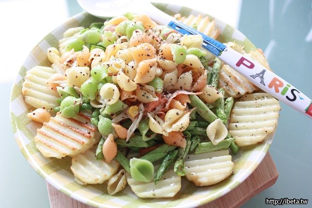 刀不錯,馬鈴薯很快速的變成了波浪洋芋片;四季豆切段;貝殼麵燙半熟;