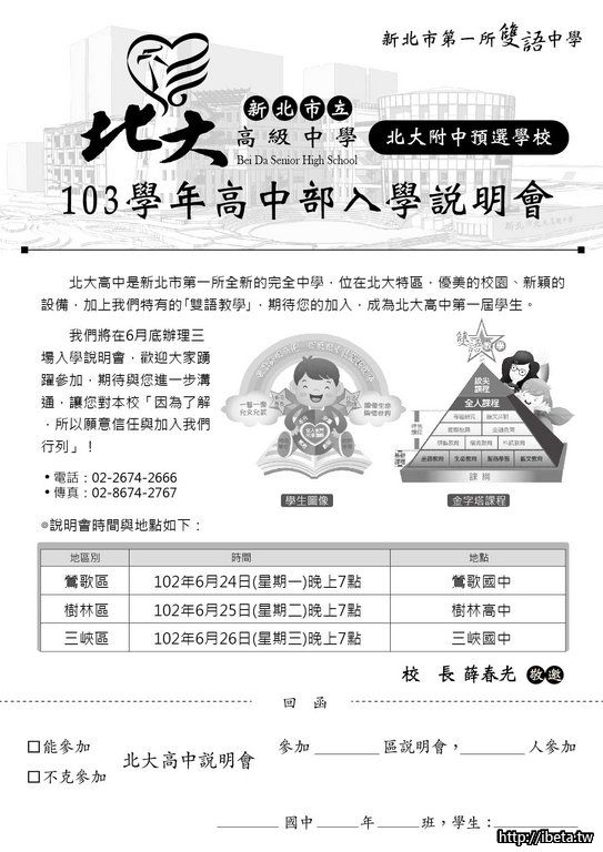公告上很清楚的寫著是103年度高中部入學說明, 對象必然是指現在就讀國中 7年級與 8年級子女的家長們 (明年就9年級畢業了), 所以到這三所國中開入學說明會 ~~這自然沒有國中部新生的說明囉.